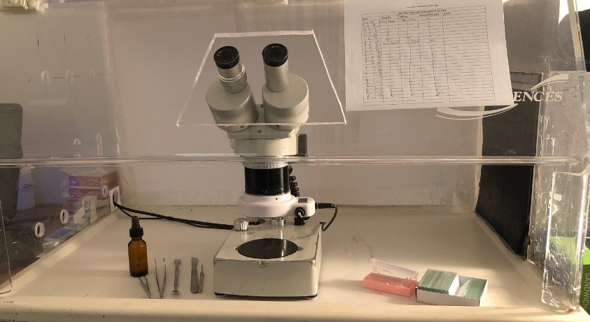 All samples are (and should be) delivered in airtight containers. Once received, we open the contained samples once under a particle hood enclosure. This enclosure lets air in naturally (using negative pressure) and routes it through a high efficiency particulate air (HEPA) filter to prevent particles of asbestos from entering ambient air, ensuring the analyst’s safety. Before opening the samples, it’s important that the particle hood is drawing air at approximately 100 ft/min. This is measured and recorded monthly using an instrument called a vaneometer. After reading the correct speed, the containers can be opened safely.